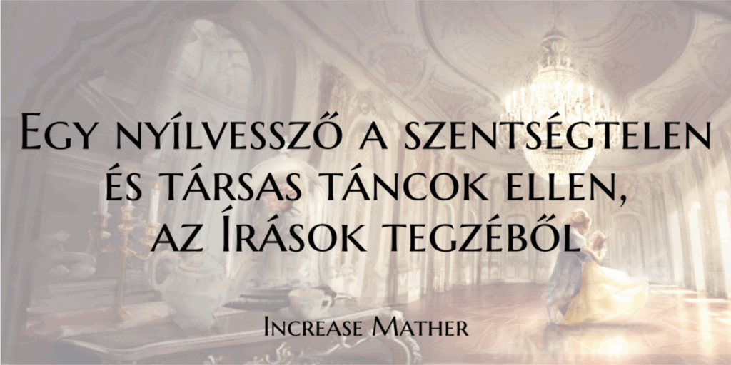 II. Következtetés. Új-Angliában mindazok az egyháztagok, akik gyermekeiket olyan társastáncokra küldték, ahol ifjak és hajadonok együtt szerepeltek – akár mint résztvevők, akár mint nézők –, komoly megalázkodásra köteleztettek. De álljunk meg egy pillanatra! Miféle beszéd ez?! Új-Angliai egyháztagok és gyermekeik – társastáncokon! Álmélkodjatok egek! Kétségkívül Ábrahám nem tud is minket: és Izráel nem esmér is minket. Ha atyáink feltámadnának sírjaikból, nem ismernék el az ilyen gyermekeket sajátjuknak. Több tanult és szent ember megfigyelte már, hogy Jób így írja le az istentelenek jellemét: „Az ő apró fijaikat, mind a sereg juhokat úgy bocsátják ki, és az ő magzatjaik tánczolnak. Ragadják a dobot és a hegedűt, és az orgonának zengésének örülnek.” (Jób 21:11–12). Mr. Caryl megjegyzése e szavakra ez: A világi emberek hiábavalóságban nevelik gyermekeiket. Ez az egész vallásuk. Az a káté, amelyre a gonosz emberek tanítják gyermekeiket: táncolás és éneklés. Nem mintha a tánc, a zene vagy az éneklés önmagában bűnös tett volna; hanem amikor a táncmester istentelen, azok többnyire bujálkodásra vezetnek, és így utálatossá lesznek. De ti, akik a hitnek megvallói vagytok – akarjátok-e, hogy gyermekeitek ilyet tanuljanak? Az Úr azt várja, hogy azokat a gyermekeket, akiket az ő nevébe kereszteltettek meg, másféle nevelésben részesítsétek – hogy az Úr feddésében és intése szerint neveljétek őket. És vajon nem halljátok az Urat, amint így perel veletek: „Elvettétek az én gyermekeimet – azokat a gyermekeket, akiket énnekem adtak; azokat, akik ünnepélyesen elköteleztettek arra, hogy lemondjanak a Sátán pompáiról – és vajon ez csak könnyű dolog lenne, hogy e gyermekeket elvettétek tőlem, s beavattátok őket a gonosz pompáiba és hiábavalóságaiba, a szövetség ellen?” Mit feleltek majd, mikor az Úr számadásra szólít benneteket? Megvan bennünk az irántatok való oly szeretetünk, hogy úgy véljük: tévedésetek tudatlanságból fakadt, és nem szándékos gonoszságból. Ezért is tartottuk kötelességünknek, hogy az igazságra tanítsunk titeket. Ha nem határozzátok el magatokat a megjobbításra, menthetetlenek maradtok. Akárhogyan is történjék, mi most bizonyságot tettünk, és megmentettük lelkünket. Eszedbe vegyétek a mellyeket mondunk. Adjon azért az Úr néktek értelmet mindenekben.