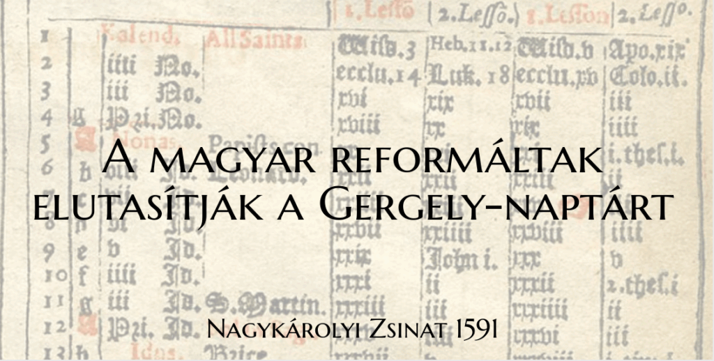 Draskovich György győri püspök és királyi helytartó adta ki először Magyarországon a rendeletet, hogy az 1582. év október 4-dik napjától fogva az uj XIII. Gergely-féle naptár szerint kell az időszámitást megkezdeni. De az ellen magok a római katholikusok is oly ellenszegüléssel viseltettek, hogy midőn annak életbeléptetését Rudolf király az 1583-ki zajos országgyűlésen sürgette, a rendek mit sem akartak róla hallani. Sőt még akkor is, midőn az 1587-dik év november 14-dikén a királyi teljhatalommal ellátott Ernő főherceg a király nevében indokolva felhivta a rendeket, hogy mondják ki, miszerint ezentul Magyarországon egyedül az uj kalendáriom használtatik: a rendek a király kivánatához képest nem ellenezték ugyan, hogy az uj naptár vétessék használatba; de akkor is, egyrészt a pápa hatalmát nem akarván az országban nevelni, másrészt a protestánsok féltékenységét is óhajtván kimélni, határozottan kijelentették, hogy ezen uj naptárt senki más, hanem egyedül a király tekintélye alapján fogadják el; azzal a kikötéssel azonban, hogyazok az okiratok, melyek eddig a régi naptár szerint keletkeztek, érvényesekül tekintessenek. Mindennek dacára a protestánsok e naptárt tényleg el nem fogadták, sőt még az 1591-dik év február 10-dik napján is 12 egyházmegye képviselői gyültek össze Nagykárolyban, hogy ellenszegülésöket hitelveiknél fogva igazolják. Nevei az egybegyülteknek előttem ismeretlenek, azonban zsinatuk határozatát a Szilágyi Bénjámin István synodaliái közt, egy igen régi kéziratban feltaláltam, melynek hü fordítása itten következik: