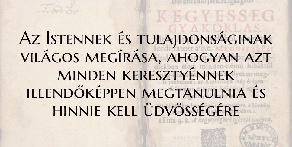 Eddig lőn a Tanuság az Istennek egyetlen voltáról s abbéli Állandóságoknak különböző módjairól, a Személyekről, ennekutánna immár az isteni tulajdonságokról tanulunk.